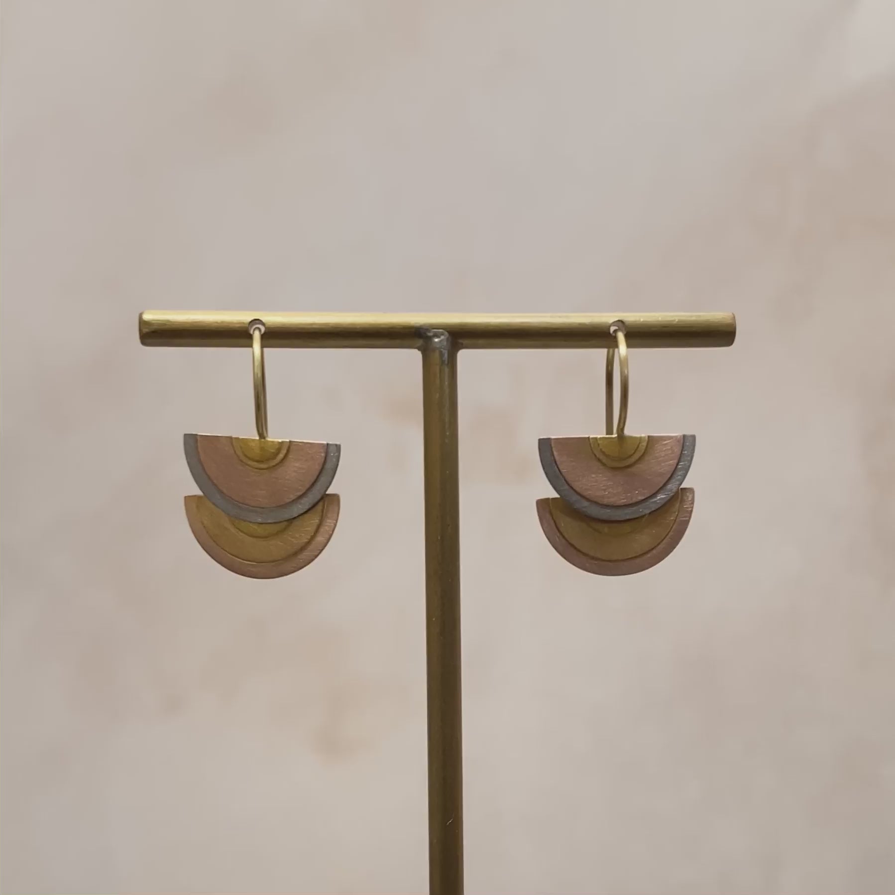 Two small layered arcs in rose gold tones, swinging on a gold ear hook.