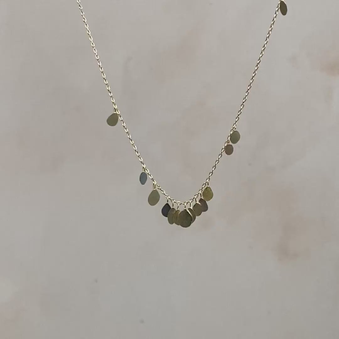 Tiny golden raindrops hanging lightly from a fine gold chain. Each one of these necklaces is unique as every hand-cut raindrop is different.