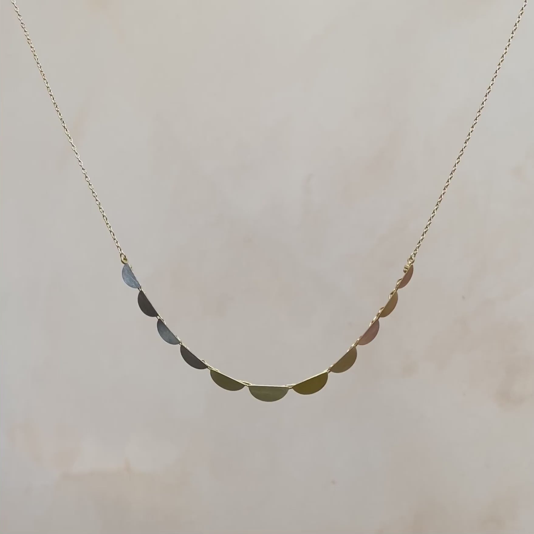 An arc of half-moons decreasing in size as they phase outwards from the centre of a fine gold chain