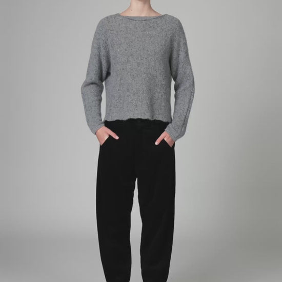 Oversized wool and alpaca blend sweater. Ribbed boat neck with rolled edge. Bat sleeves with ribbed cuffs.