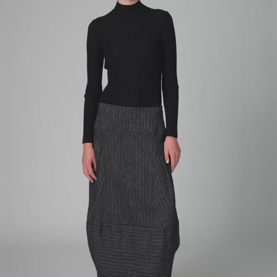 Comfort fit lined skirt with a bombé shape, made of a soft stretch wool and linen blend. Adorning this calf-length garment are two deep pleats on the front and a sizeable flounce at the bottom. It is fastened at the back, with a central zip.