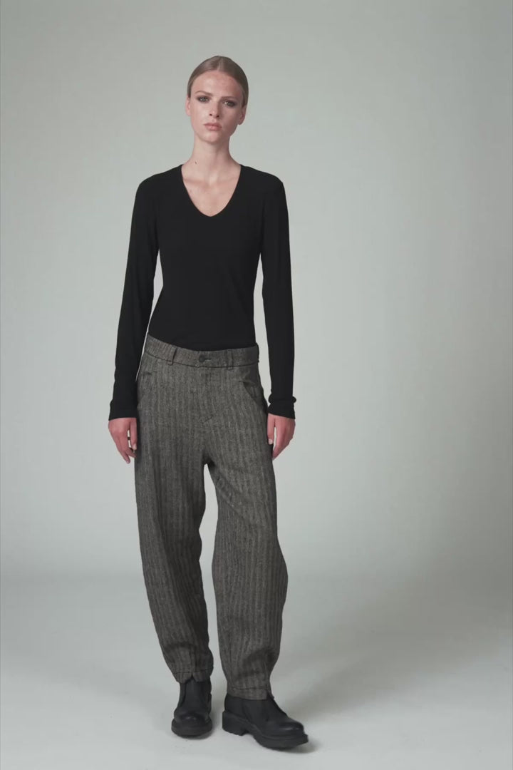 Relaxed-fit trousers with a slightly rounded leg, crafted from a soft, stretch wool-linen fabric with a herringbone pattern. They feature a slit at the bottom of the leg and rounded French pockets. The back is embellished with a vertical cut and a stylish pocket welt.