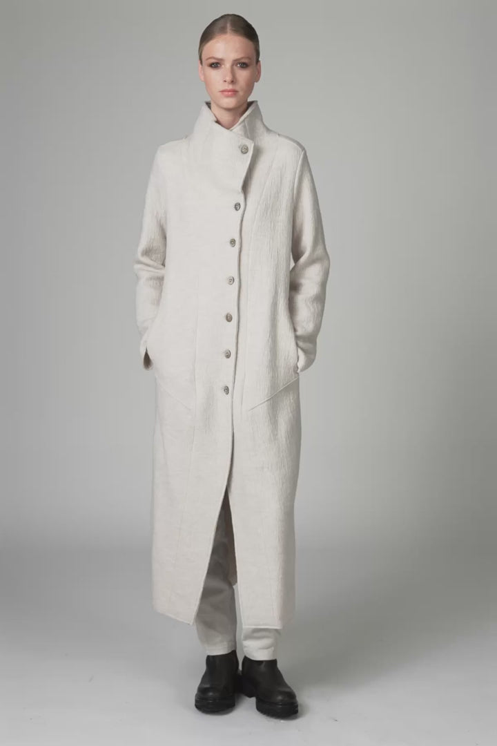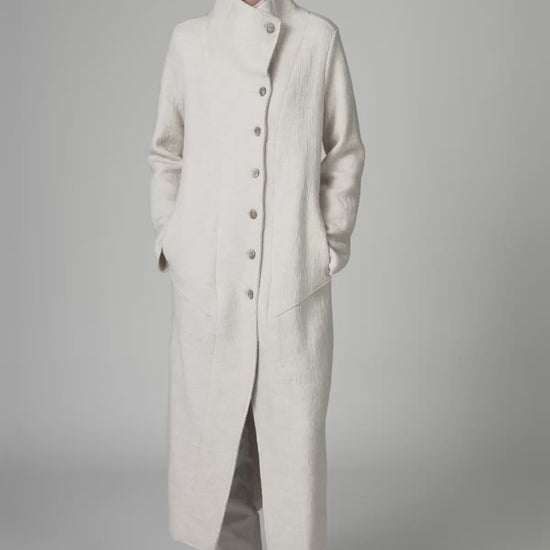 Long, slim-fit unlined coat made of knitted wool and viscose, with a herringbone pattern on one side. It has a high collar, side pockets and a shaped fastening section, with seven buttons and a jigger on the collar. Shaped and stitched raw cuts add a decorative touch to the front and back.