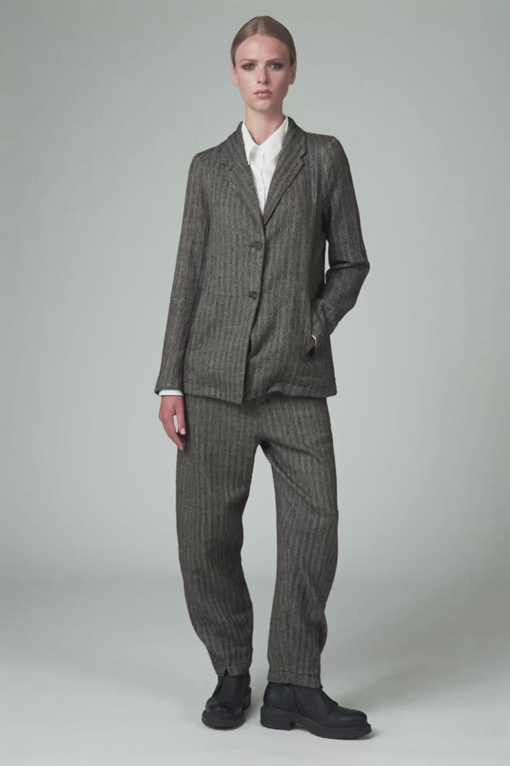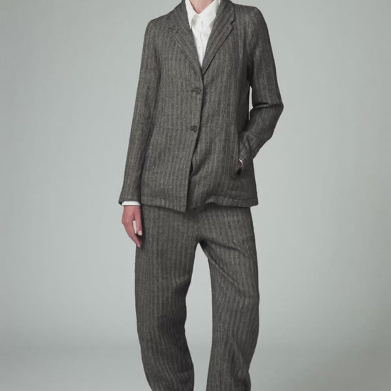 Regular-fit, two-button lined jacket with a small shawl lapel and vertical side pockets. Crafted from soft wool-linen fabric with a herringbone pattern, it features a small button closure.
